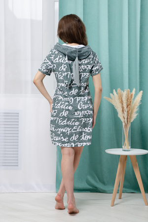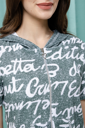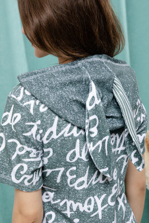 Халат на молнии, полуприлегающего силуэта, длиной выше колена, с капюшоном, с фигурной линией низа. Рукав втачной, короткий. На капюшоне "ушки". На полочке расположены фигурные накладные карманы.