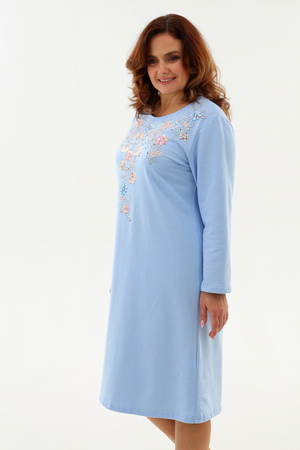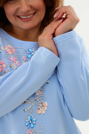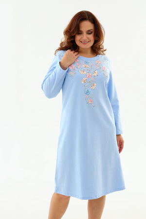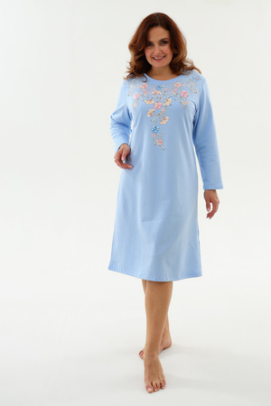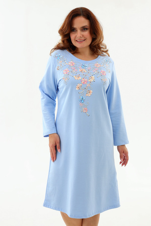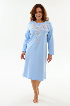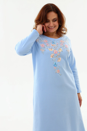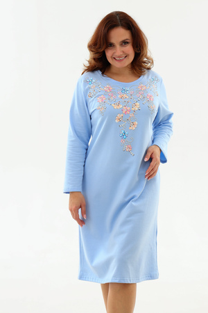 Тёплая уютная сорочка из футера 2-х нитки с начёсом. Горловина обработана обтачкой и отстрочена плоским швом. Очень нежный принт в виде орнамента из цветов и жемчуга. Изнанка очень приятная к телу, так как в составе 100% хлопок. Носите с удовольствием !