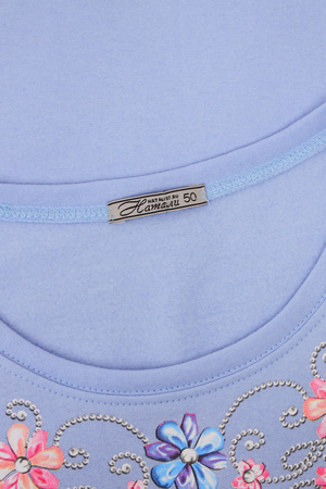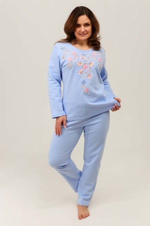Женская пижама из футера 2-х нитки с начёсом. Дизайн позволяет использовать данную модель как пижаму для сна, так и в качестве костюма для дома. Брюки и лонгслив свободного кроя. Нежный изящный принт в виде россыпи жемчуга и цветов. В измерениях обхвата талии указан размер резинки, которая растягивается без проблем до стандартных измерений фигуры. Очень удобная высокая посадка брюк. Длинные рукава для уюта и тепла.