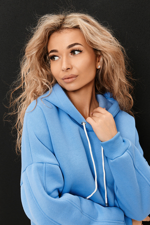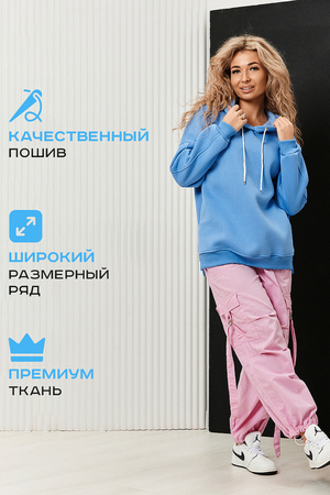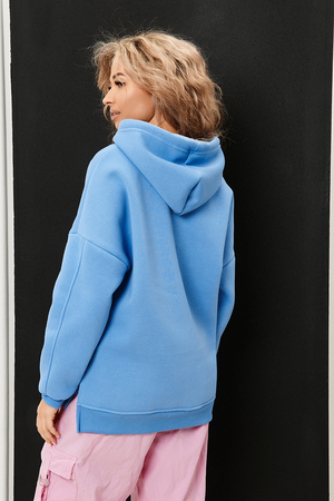 Толстовка утепленная, прямая, свободная, с удлиненной спинкой, с капюшоном. Рукав длинный, с продольным лампасом, на эластичном манжете. На полочке обработаны боковые карманы. В нижней части боковых швов обработаны разрезы. Низ полочки и спинки завершен эластичным поясом.