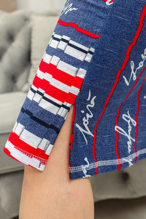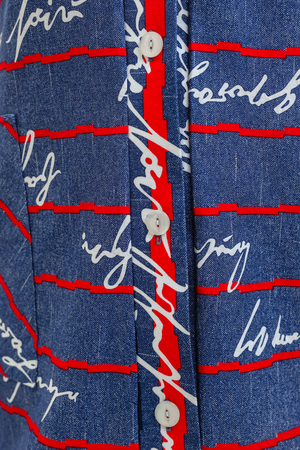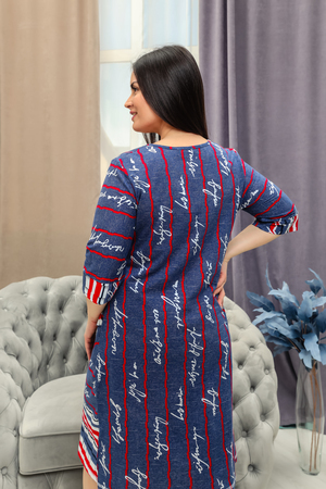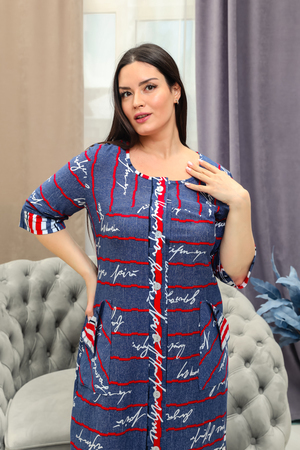 Халат с застежкой на петли и пуговицы, полуприлегающего силуэта, длиной ниже колена, с округлой горловиной, с фигурными накладными карманами. Рукав втачной, длиной 3/4, с манжетом. В верхней части полочки расположены кокетки. С разрезами в нижней части боковых швов. Горловина обработана бейкой из основного полотна.