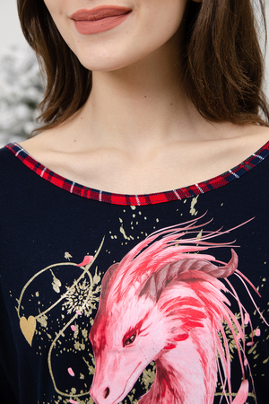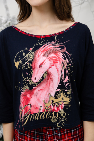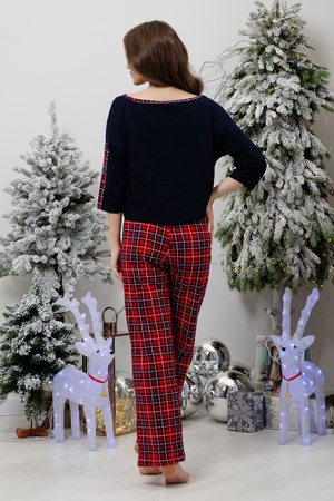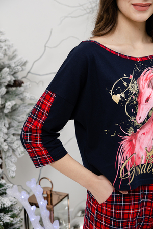 Костюм состоит из туники и брюк. Туника с округлой горловиной. Рукав длиной 3/4, с отделочной вставкой вдоль рукава. Горловина обработана бейкой из отделочного полотна. Брюки прямые, на поясе, с боковыми карманами.