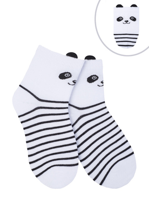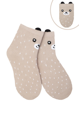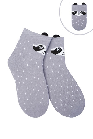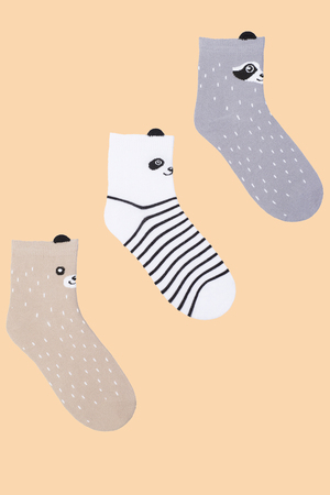 Носки детские с вязаными рисунками в виде енотика, панды и медведя с ушками. В комплекте 3 пары: бежевые, серые и белые, по 1 паре каждой расцветки. Состав ткани: 80% х/б, 17% п/а, 3% эластан. Возможен заказ в розницу. Арт. НД281