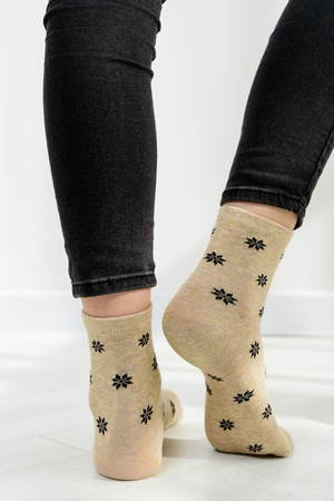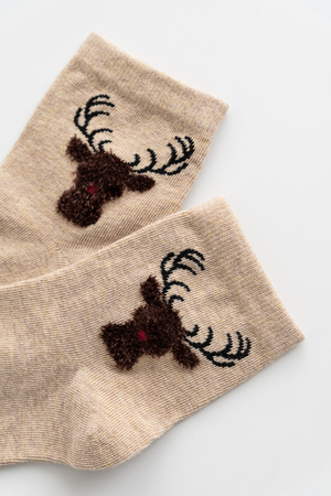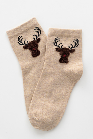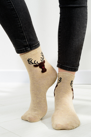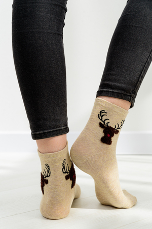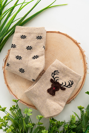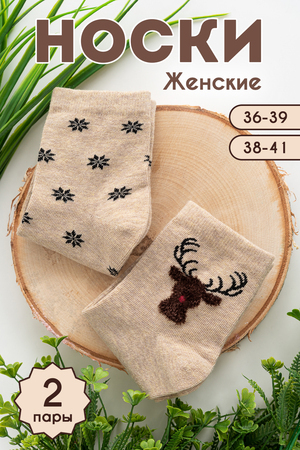 Новогодние носочки для женщин. Комплект 2 пары. Одна пара с изображением силуэта оленя на верхней части носка, на другой паре по всему носку изображения снежинок. Олень связан из фантазийной пряжи с "пушком"