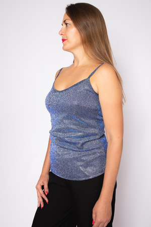 Майка полуприлегающего силуэта на бретелях, длиной до бедер. На переде нагрудные вытачки и V-образный вырез. Красивый сверкающий блестящий эффект как от вещи со стразами. Эта стильная новинка поможет создать вам яркий и удобный образ. Приталенная и удобная посадка смотрится на фигуре любого типа. Топ кроп женский с глиттером для тех, кто готов выступить в деловом в повседневный и праздничном луке. Оригинальная вязка базовой майки с акцентными линиями выглядит эффектно и подчеркнёт грудь и фигуру. Длина позволяет носить его как на выпуск, так и заправляя в брюки, юбку, шорты и джинсы.