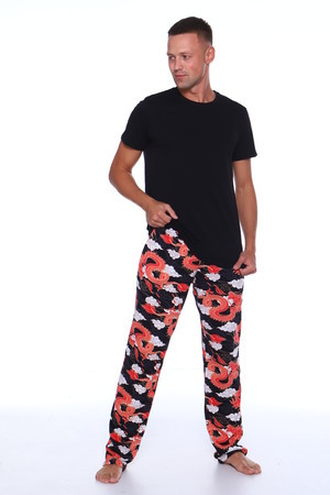 Комплект состоит из футболки и брюк. Футболка свободного кроя, с коротким рукавом, круглым вырезом горловины, который обработан рибаной. Брюки прямого кроя с карманами.