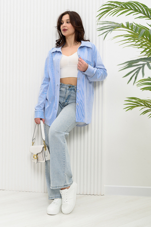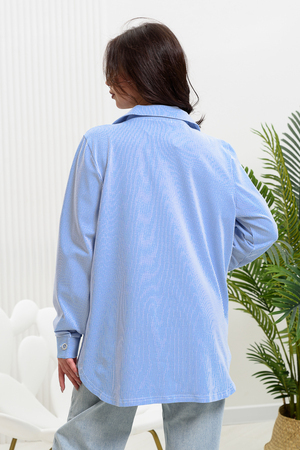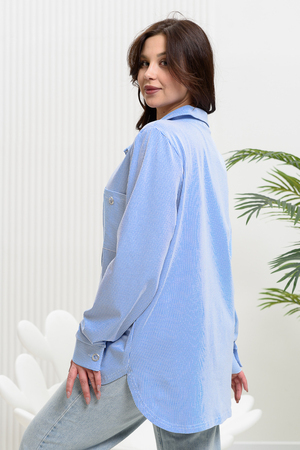 Рубашка женская прямого силуэта с отложным воротником. Застежка на петли-пуговицы. Рукав длинный, втачной с манжетой. Низ туники фигурный, спинка несколько длиннее полочки. На полочке нагрудный карман. Ткань в мелкую полоску особенно актуальна в этом сезоне.