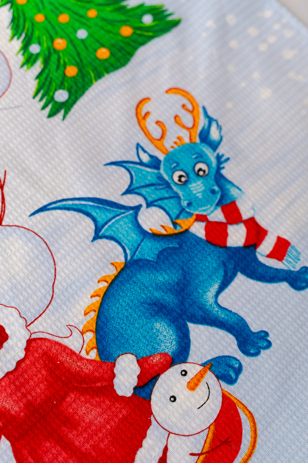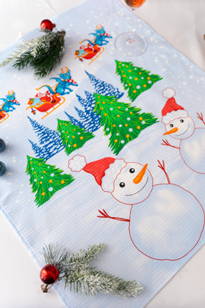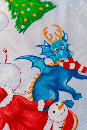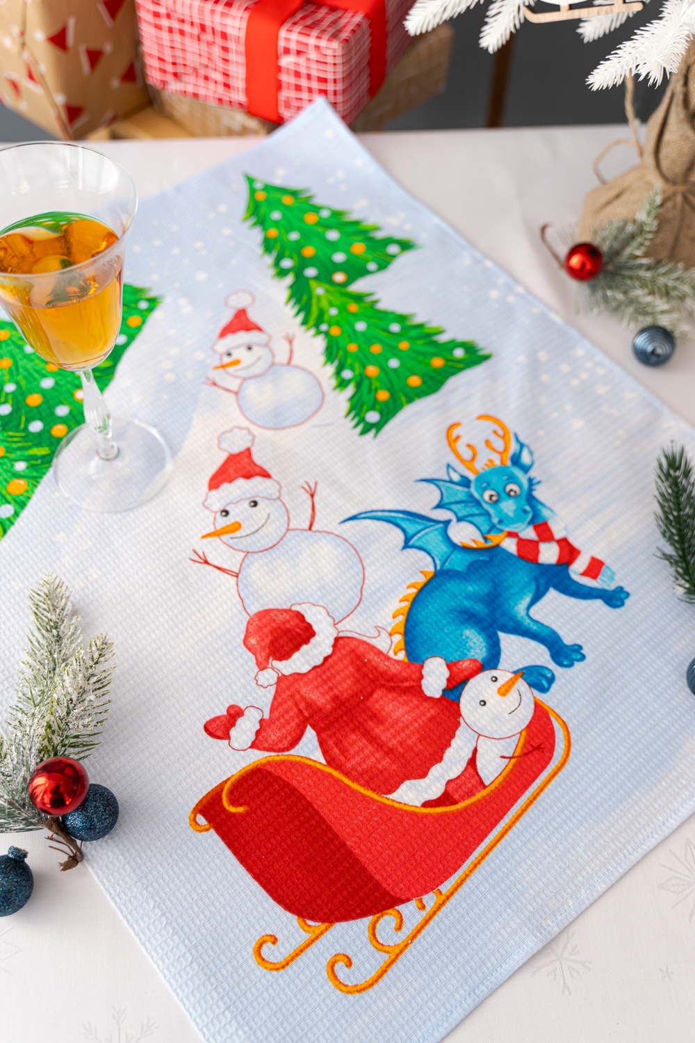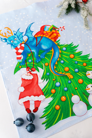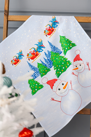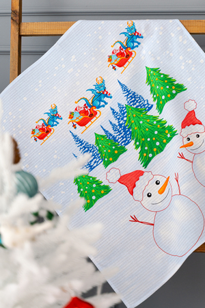 Набор из трех кухонных полотенец Новогодние забавы отличное решение в качестве подарка для близких на Новый год. Вафельные полотенца с новогодним рисунком и символом 2024 года украсят ваш дом и наполнят кухню атмосферой волшебства и подарят праздничное настроение. На изделиях нарисован забавный дракон и снеговики. К каждому полотенцу пришита петелька.