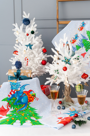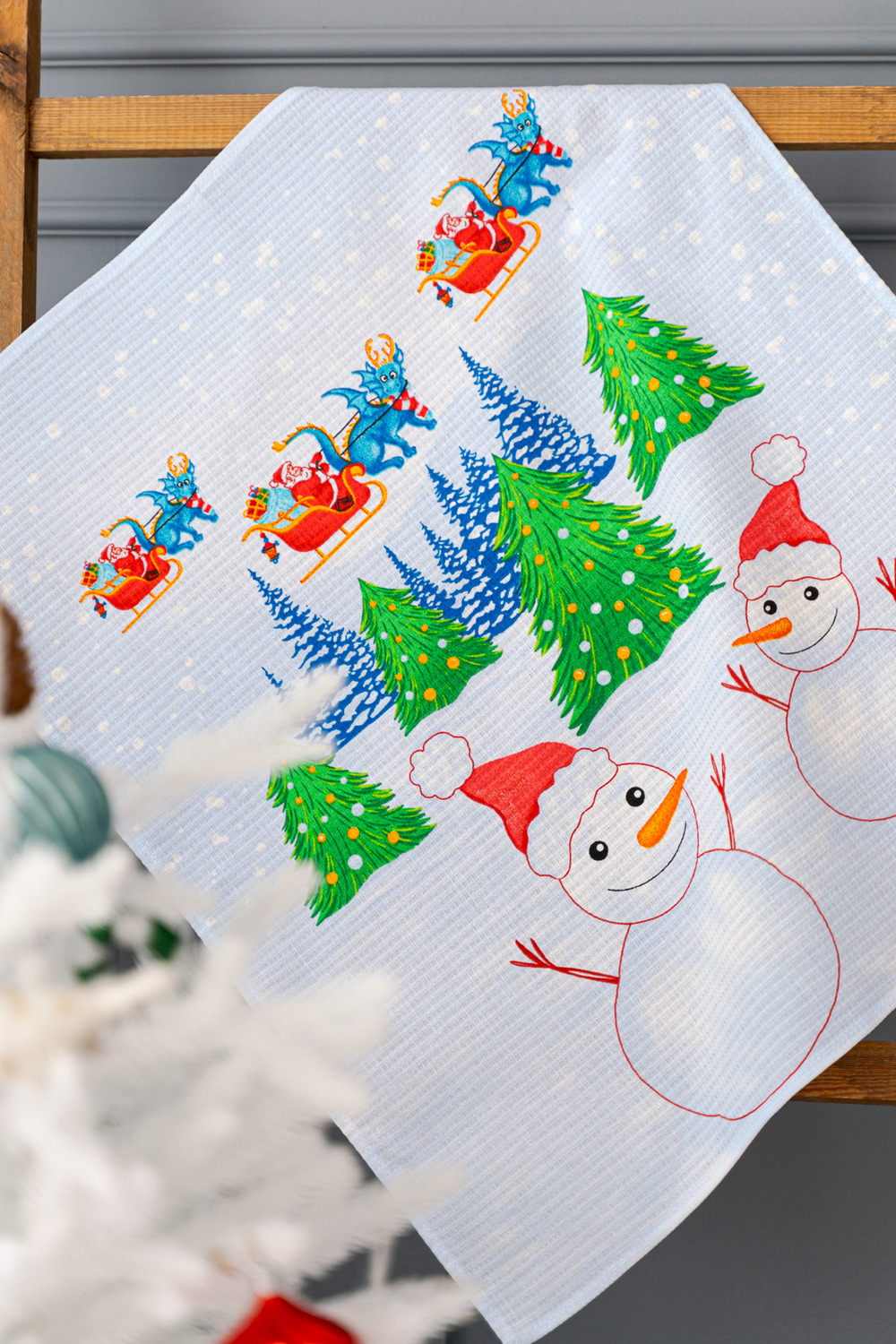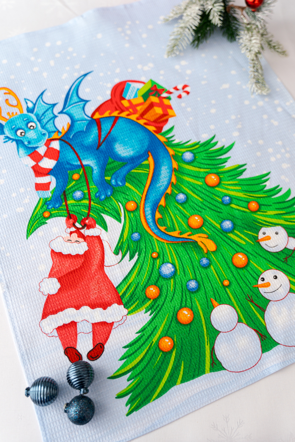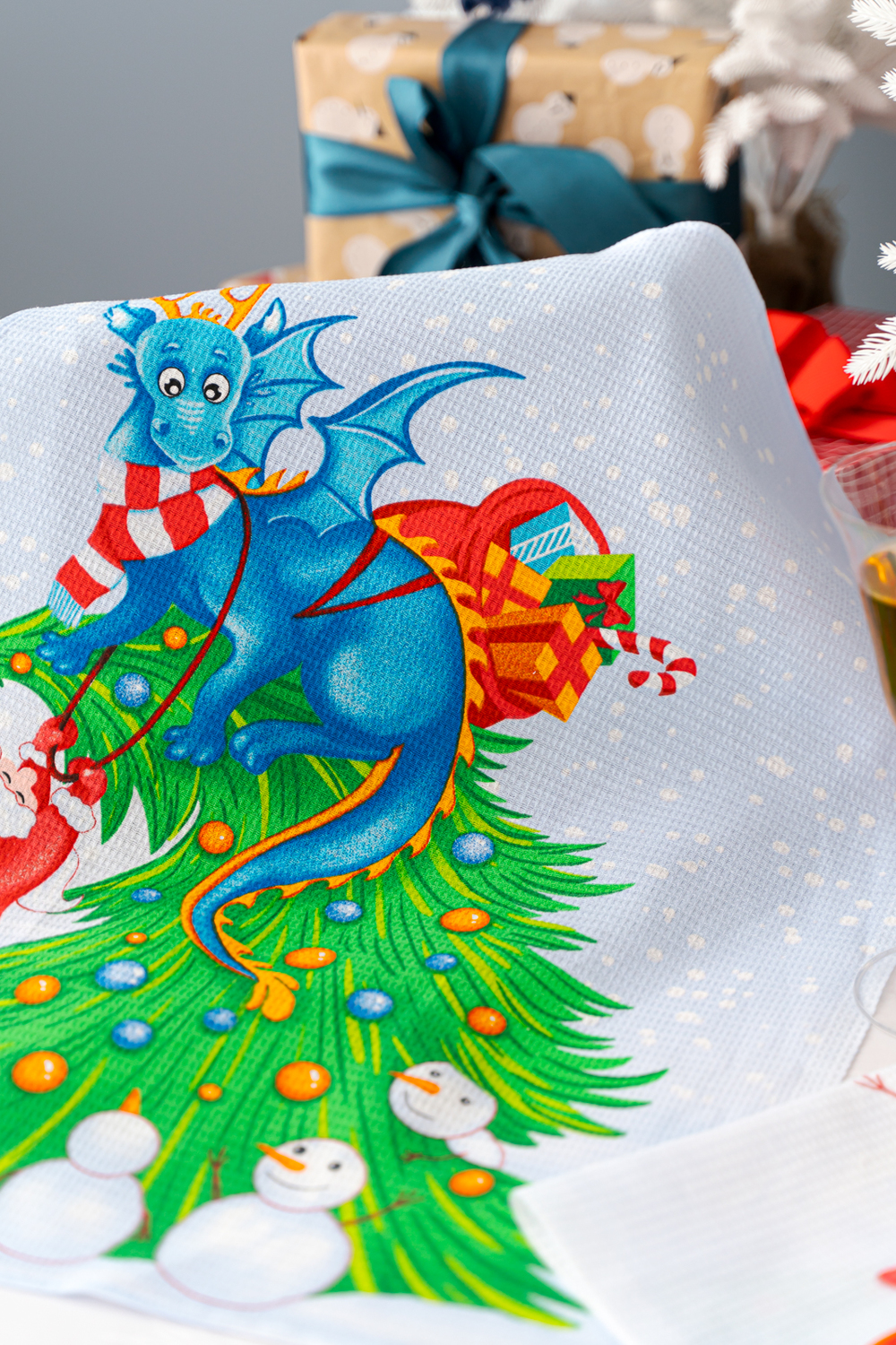 Набор из трех кухонных полотенец Новогодние забавы отличное решение в качестве подарка для близких на Новый год. Вафельные полотенца с новогодним рисунком и символом 2024 года украсят ваш дом и наполнят кухню атмосферой волшебства и подарят праздничное настроение. На изделиях нарисован забавный дракон и снеговики. К каждому полотенцу пришита петелька.