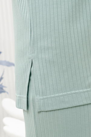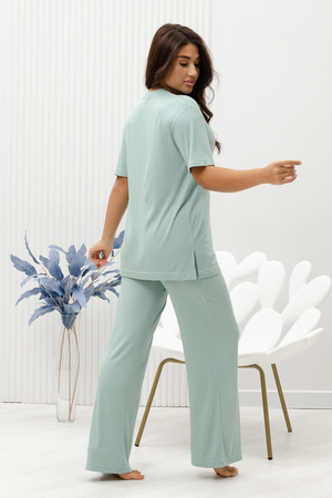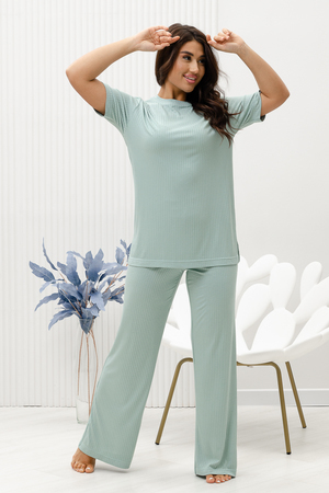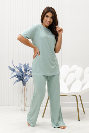 Красивый, стильный, уютный домашний костюм состоящий из брюк и удлинённой футболки. Брюки свободные, широкие. Цельнокроеный пояс брюк с комфортной широкой резинкой имеет аккуратный вид за счёт обработки на специальной поясной машине. Футболка свободного кроя с разрезами по бокам со спущенной проймой; округлая горловина обработана планкой и отстрочена. Комплект выполнен из вискозного полотна с плетением "в рубчик", так называемым "лапша", которая остаётся в тренде уже не первый сезон. Вискоза универсальный материал - легко пропускает воздух, "дышит", благодаря этому свойству, в изделиях из вискозы комфортно и в холодное время года, и в тёплое. Ткань отличается мягкостью и лёгкостью, вещи из неё нежные и приятные на ощупь и внешне привлекательны. Добавление лайкры прибавляет эластичности, поэтому материал хорошо тянется. Благодаря особенностям материала создаётся лёгкий струящийся образ. В таком ансамбле можно принимать внезапно пришедших гостей, проводить свободное время, летом ходить на прогулки. Универсальный фасон, создающий модный образ, подойдёт как молодым девушкам, так и дамам солидного возраста.