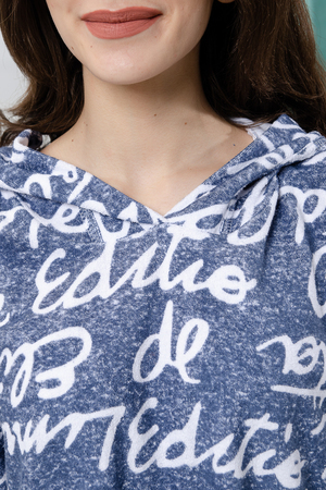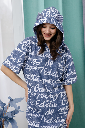 Туника в стиле "оверсайз". Прямая, свободная, длиной выше колена, с капюшоном. На капюшоне расположены "ушки". Рукав короткий. В нижней части боковых швов обработаны разрезы.