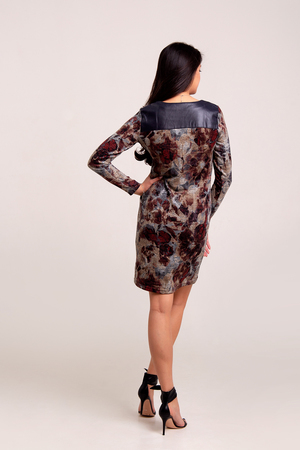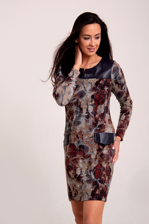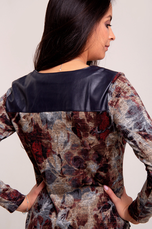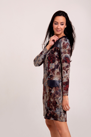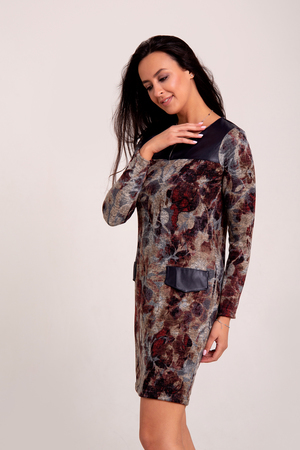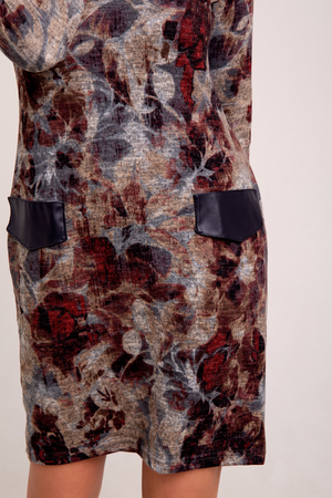 Оригинальное платье приталенного силуэта покоряет с первого взгляда. Модель оформлена абстрактными принтами по всей длине изделия. Кроме того, изделие декорировано вставками контрастного цвета из экокожи на груди, карманах -"обманках", а также на спинке. Рукав длинный. Вырез горловины округлый, дополнен небольшим разрезом. Состав: 15% ангора, 80% полиэстер, 5% эластан. Длина изделия 86 см.