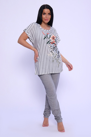 Уютный женский костюм из 100% хлопка в очаровательную полоску. Костюм состоит из кофты с короткими рукавами и брюк. Яркий принт на кофте в виде легкой цветочной гирлянды будет оставаться ярким и качественным даже после многочисленных стирок. Брюки сшиты из яркой, качественной, натуральной трикотажной ткани. Костюм идеально подойдет для прогулок, занятий спортом или для повседневной носки. В этом костюме вам будет очень удобно, при этом вы будете себя чувствовать комфортно и расслабленно.