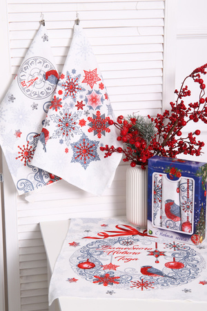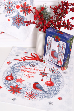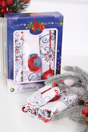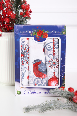 Даже самый скромный подарок выглядит дороже, если он красиво упакован. Порадуйте своих друзей, близких, коллег подарком на Новый год. Набор из трех полотенец, размером 48*60 см выполнен из прочного хлопчатобумажного полотна - рогожка. Каждое полотенце с индивидуальным рисунком. Набор упакован в яркую картонную коробку с новогодним дизайном.