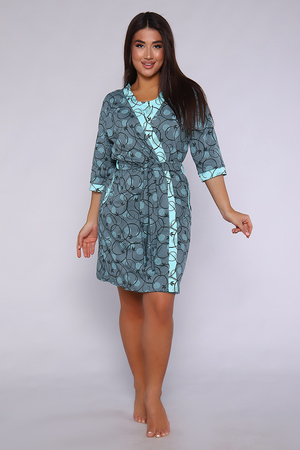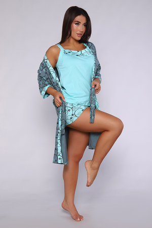 Пижамный костюм из кулирки халат + майка + шорты. Запашной халат с поясом, рукава чуть ниже локтей. Однотонная майка на узких лямках, цветочные вставки. Короткие шорты.