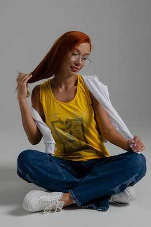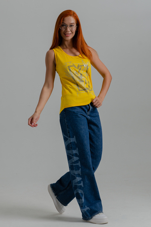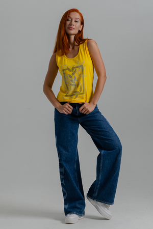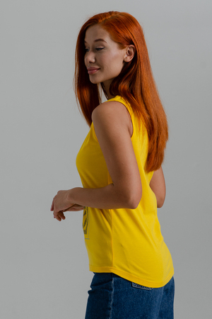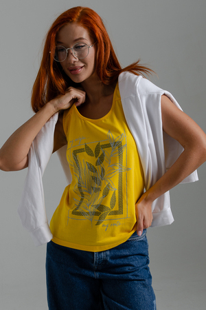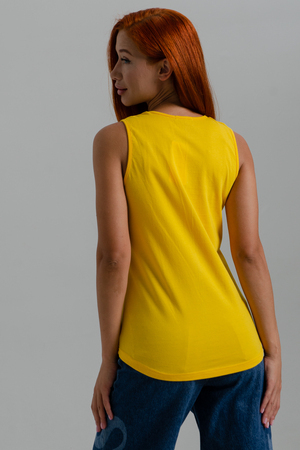 Майка прилегающего силуэта, с округлой горловиной. Полочка с кокетками. Горловина, проймы обработаны бейкой из основного полотна.