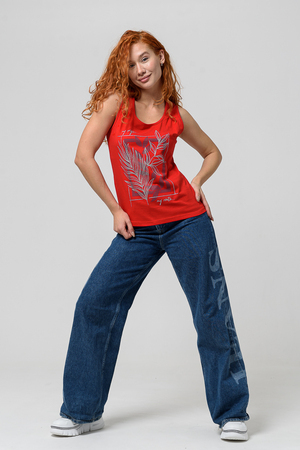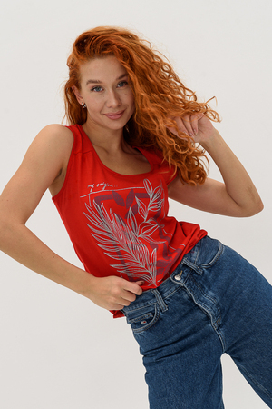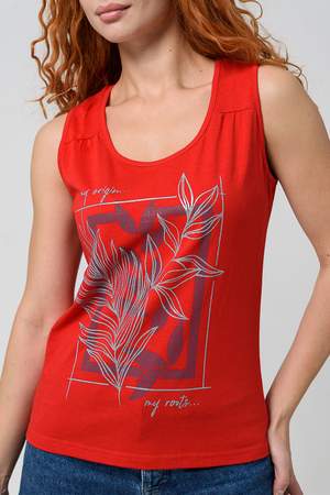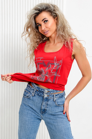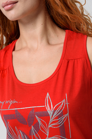 Майка прилегающего силуэта, с округлой горловиной. Полочка с кокетками. Горловина, проймы обработаны бейкой из основного полотна.