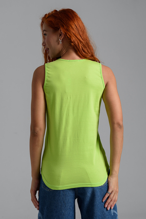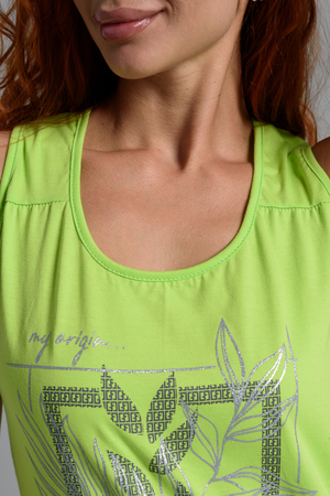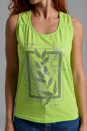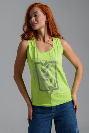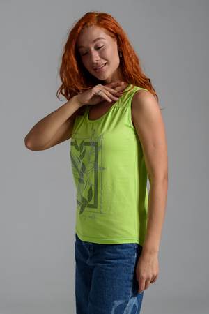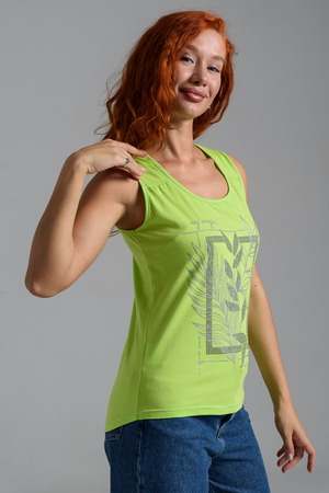 Майка прилегающего силуэта, с округлой горловиной. Полочка с кокетками. Горловина, проймы обработаны бейкой из основного полотна.