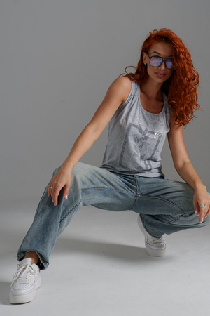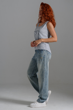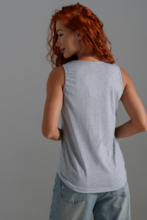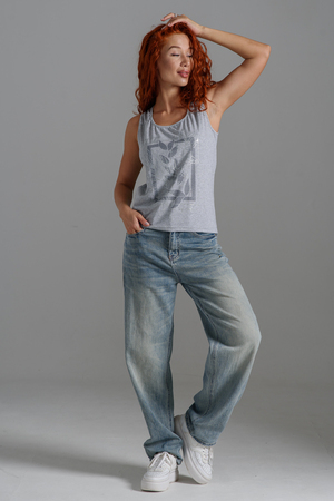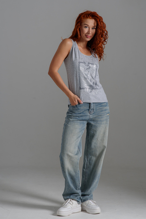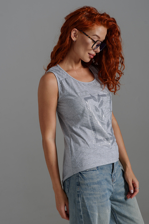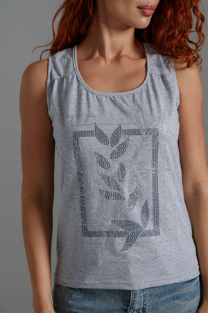 Майка прилегающего силуэта, с округлой горловиной. Полочка с кокетками. Горловина, проймы обработаны бейкой из основного полотна.