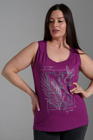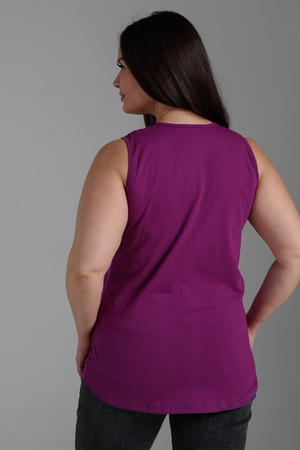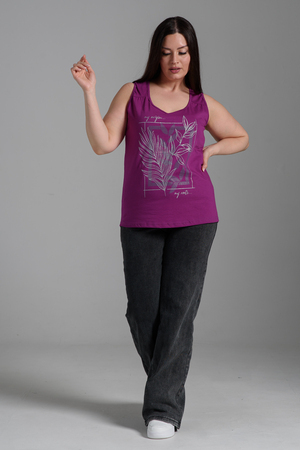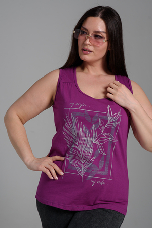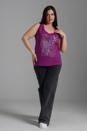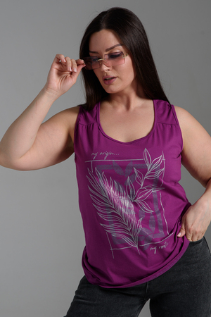 Майка прилегающего силуэта, с округлой горловиной. Полочка с кокетками. Горловина, проймы обработаны бейкой из основного полотна.