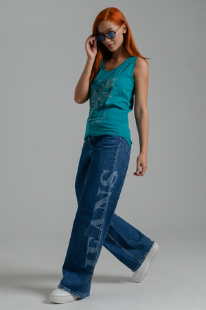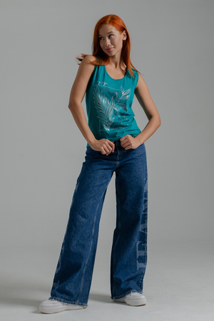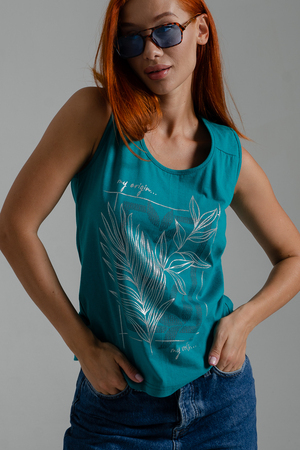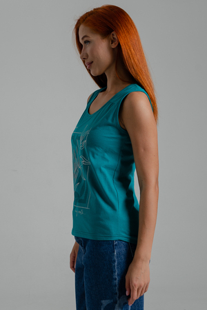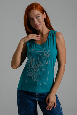Майка прилегающего силуэта, с округлой горловиной. Полочка с кокетками. Горловина, проймы обработаны бейкой из основного полотна.