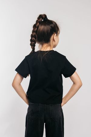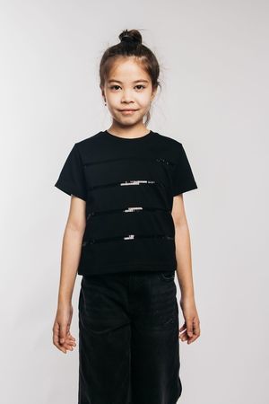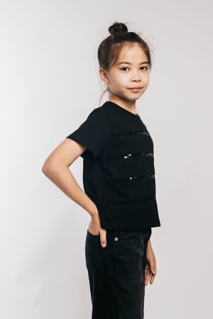 Футболка для девочки выполнена в черном цвете, что делает ее универсальной и практичной. Черная футболка — это классика, которая всегда в моде. Она идеально подходит как для школы, так и для домашнего использования. Укороченная футболка станет любимой вещью вашенй девочки. Модные решения бренда LetsGo всегда учитывают последние тенденции, поэтому эта футболка с пайетками будет выглядеть свежо и актуально. Она может быть использована как домашняя или нарядная. Широкий силуэт обеспечивает удобство и свободу движений. Футболка с размерной линейкой со 134 по 164 рост. Изготовленная из хлопка, эта футболка обеспечивает максимальный комфорт при носке. Оригинальная вышивка пайетками делает эту футболку особенной. Подчеркните стиль вашего ребенка с помощью этой уникальной футболки. Если вы ищете стильную, комфортную и практичную одежду – эта черная футболка будет отличным выбором! Тип полотна - кулирная гладь. Дизайн полотна - однотонный. Посадка - свободная. Силуэт - прямой. Длина - до бедра. Короткий втачной рукав. Круглый вырез горловины. Декор - пайетки.