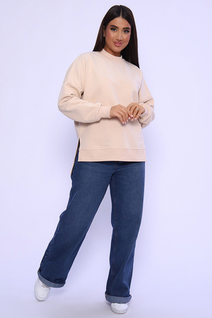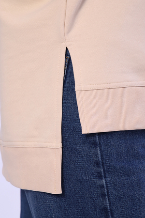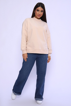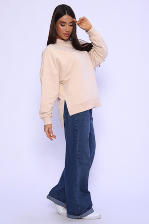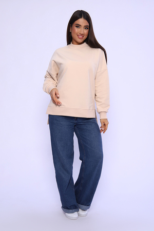 Свитшот женский выполнен в классических цветах. Особенность этой модели - спущенный рукав (летучая мышь), удлиненная спинка и боковые разрезы. Округлая горловина декорированная отстрочкой. Свитшот изготовлен из футера 3‑х нитки (петля). В 52 и 54 размеры, по спинке шов.