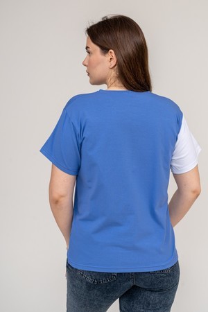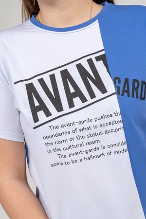Футболка для женщин, прямого силуэта. Рукав втачной, короткий. Горловина округлая. Полочка изделия с асимметричным вертикальным резом и буквенным принтом.