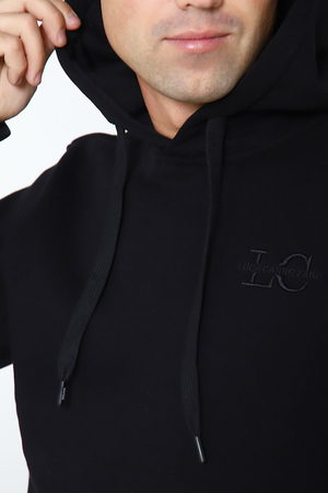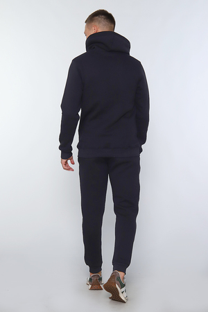 Костюм мужской изготовлен из качественного футера трехнитки с начесом, идеальный вариант для холодных зимних дней. Толстовка с капюшоном, дополненным шнуром и карманом-кенгуру. На груди изделия выполнена текстовая вышивка-логотип. Брюки на резинке, для дополнительного регулирования объема талии имеется шнурок. Два боковых кармана без молнии. Брюки так же украшены вышивкой.