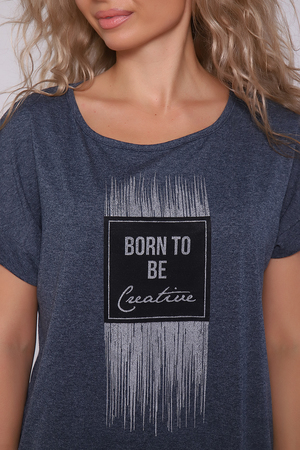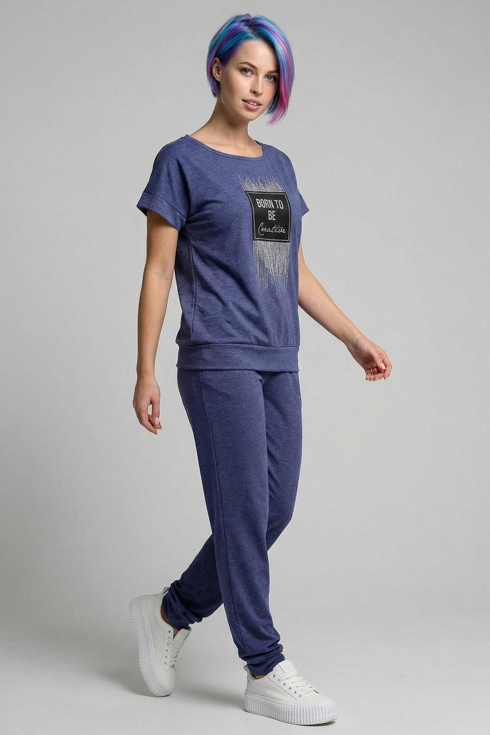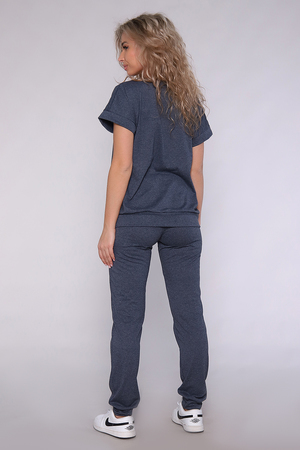 Костюм из меланжированной кулирки, смесового состава. Футболка на поясе , плечо спущено, брюки на манжетах и с карманами. Принт на футболке с блестящим глиттером.
