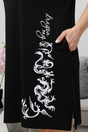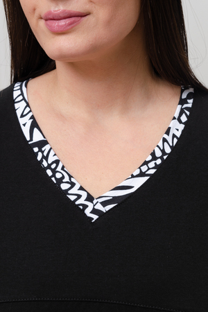 Туника полуприлегающего силуэта, с боковыми карманами, средней длины, с V-образной горловиной. Рукав втачной, короткий. На полочке расположена кокетка. В нижней части боковых швов обработаны разрезы. Горловина обработана обтачкой из отделочного полотна.