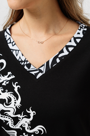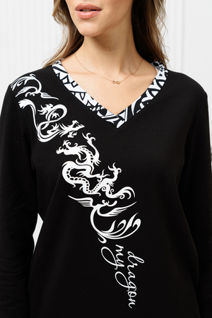 Костюм состоит из туники и шорт. Туника прямого силуэта, с V-образной горловиной, обработанной обтачкой из отделочного полотна. Рукав втачной, длинный, с манжетом. Шорты прямые, короткие, на манжете, на резинке.