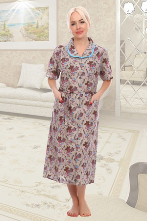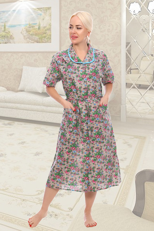 Халат из бязи. С кокеткой, короткий рукав чуть выше локтя, воротник с отделкой, пояс вкруговую, накладные карманы. Несколько вариантов расцветки, общая длина ниже коленей. Обратите внимание, халат в размерах 64-70 без пояса.