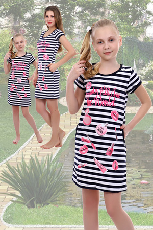 Туника из кулирки для девочек. Светлые и темные горизонтальные полоски, принт в виде изображения косметики, губ и надписей, по бокам имеются карманы, общая длина чуть выше коленей, рукава короткие. Может быть парой женской тунике Воспоминание (продается отдельно)