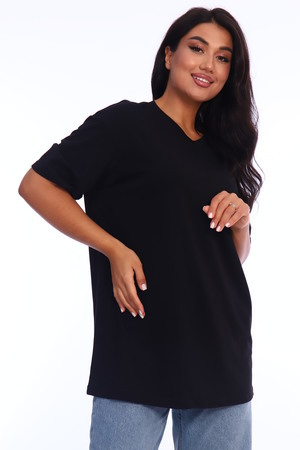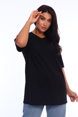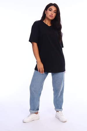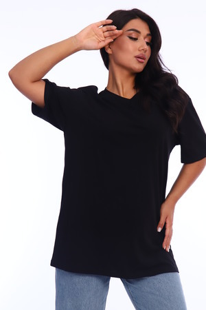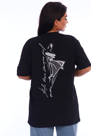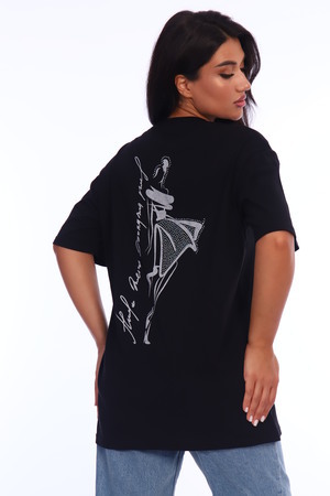 Женская футболка свободного кроя оверсайз в классических цветах - белом и черном. Она идеально подойдет для размеров 42 до 60 благодаря своей универсальности. На спинке футболки расположен рисунок, украшенный стразами, придавая изделию небольшую изюминку и делая его еще более интересным.