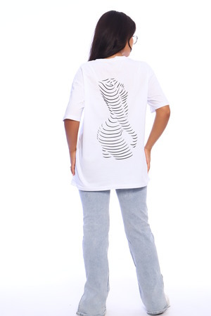 Женская футболка свободного кроя оверсайз в классических цветах - белом и черном. Она идеально подойдет для размеров 42 до 60 благодаря своей универсальности. На спинке футболки расположен рисунок, придавая изделию небольшую изюминку и делая его еще более интересным.