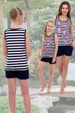 Костюм из кулирки для девочек майка + шорты. Полосатая майка, принт в виде косметики и надписей, темная окантовка, широкие лямки. Короткие темные шорты с карманами. Может быть парой женскому костюму Агата (продается отдельно). Размеры от 30 до 40. Есть возможность заказать товар по розничной цене.