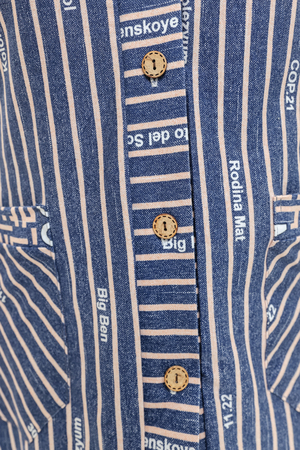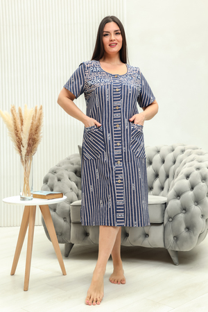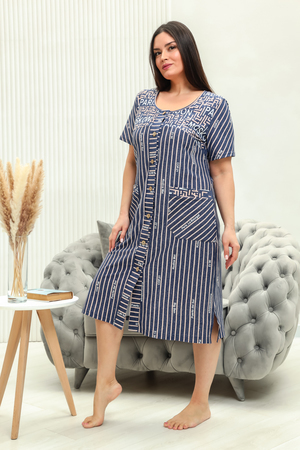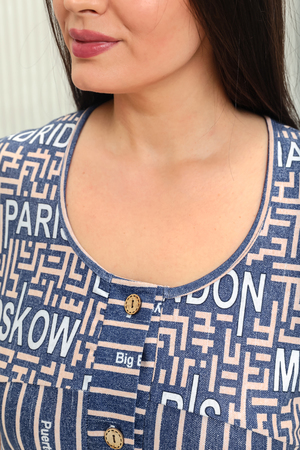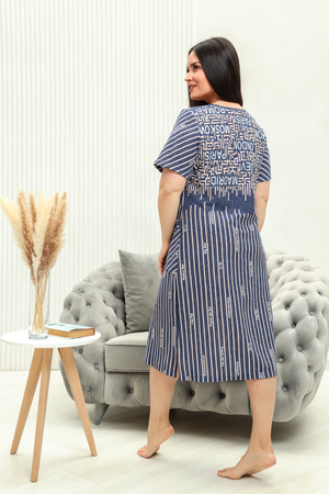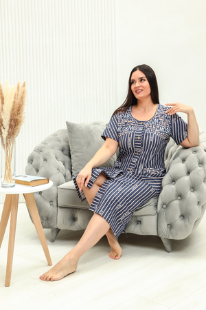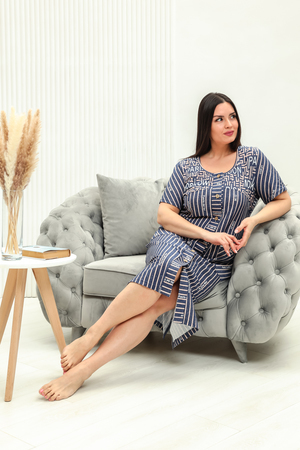 Халат с застежкой на петли и пуговицы, полуприлегающего силуэта, длиной ниже колена, с округлой горловиной, с фигурными накладными карманами. Рукав втачной, короткий. В верхней части полочки расположены кокетки. С разрезами в нижней части боковых швов. Горловина обработана бейкой из основного полотна.