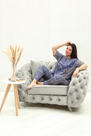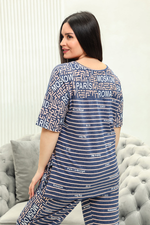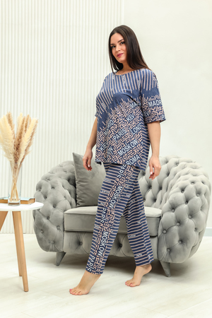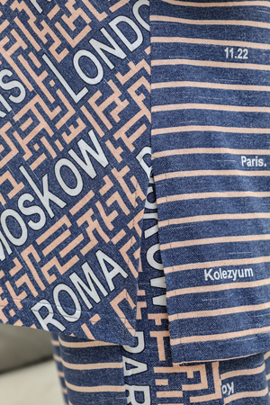Костюм состоит из туники и брюк. Туника прямого силуэта, с округлой горловиной, длиной до середины бедра. Спинка с кокеткой, удлиненная. В нижней части боковых швов обработаны разрезы. Рукав короткий. Горловина обработана бейкой из основного полотна. Брюки на поясе, с боковыми карманами, с лампасами.