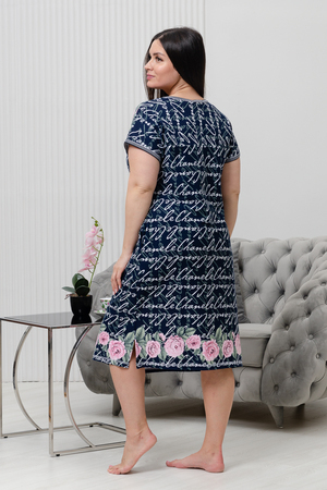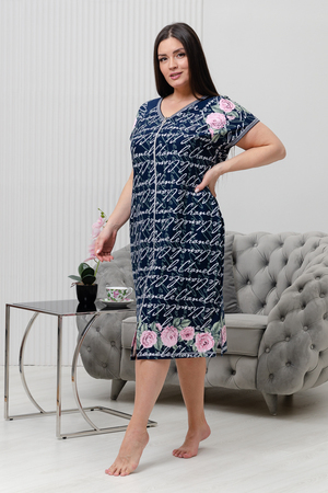 Халат с застежкой на молнию, полуприлегающего силуэта, длиной ниже колена, с V-образной горловиной. Рукав спущенный, короткий. В верхней части полочки расположены кокетки. Спинка с кокеткой. С разрезами в нижней части боковых швов. Горловина, пройма обработаны бейкой из отделочного полотна с отделочным кантом.