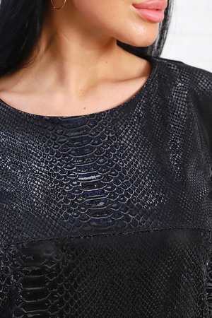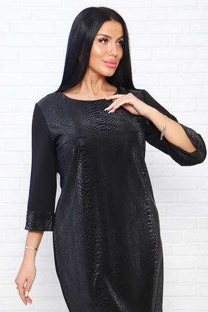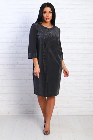 Модель свободного силуэта, длиной чуть ниже колена, рукав 3\4 . Перёд и нижняя часть рукава из трикотажной красивой эко-кожи , платье уместно будет и в повседневной носке для офиса, и подойдёт в качестве вечернего торжественного наряда. Ткань приятна к телу, не мнётся, износостойка.