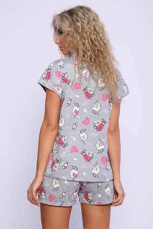 Пижама состоит из футболки и шорт. Футболка свободная со спущенным плечом. Над грудью заложены складки. Удобный и практичный вариант для дома и сна.