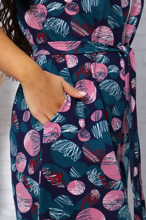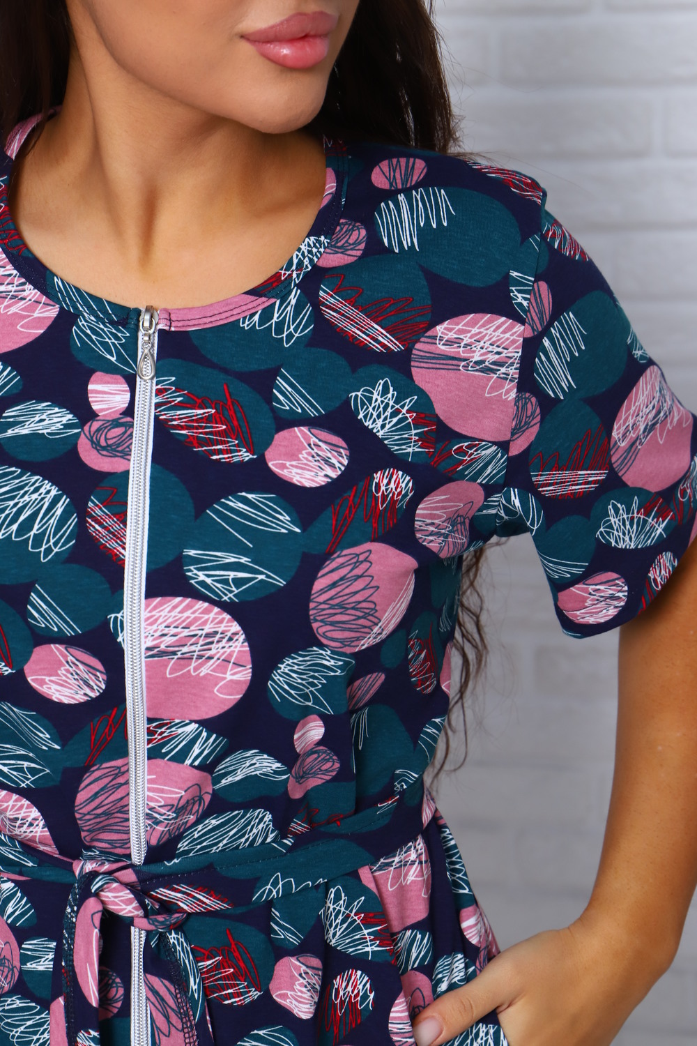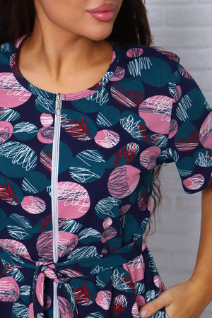Халат женский, выполнен из трикотажного полотна кулирка. Халат свободного силуэта, на молнии, с поясом, по бокам карманы.