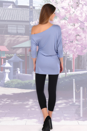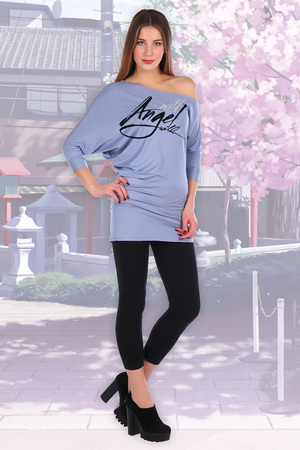 Футболка из вискозы с лайкрой с открытыми плечами, с рукавом 3/4, по низу манжет, спереди принт в виде надписи. Две расцветки — коралл и светлый индиго. В таблице замеров указана длина левого рукава, покрой асимметричный