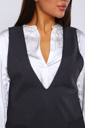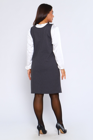 Стильный строгий сарафан для офиса и не только. Выполнен из теплой костюмной ткани - твид. Ткань очень мягкая, немного тянется, с изнаночной стороны имеет небольшой ворс. Полуприталенный силуэт, длина до середины колена, по бокам накладные карманы с клапанами. Глубокий V- образный вырез на полочке обработан обтачкой. Сарафан будет отлично смотреться со светлой блузкой или водолазкой.