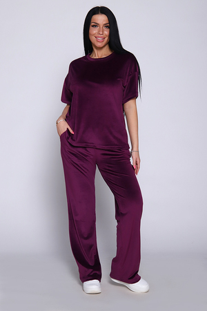 Костюм женский велюровый, повседневный, всесезонный. Костюм состоит из футболки и брюк. Футболка оверсайз прямого силуэта, длиной до бедра. Рукав втачной со спущенным плечом, длиной чуть выше локтя. Горловина с обтачкой, низ футболки с подгибкой. Брюки прямого силуэта, умеренного объема. На передних половинках брюк карманы с отрезным бочком. Пояс притачной с эластичной тесьмой. Низ брюк подгибка. Замеры объема талии брюк по нерастянутой резинке.