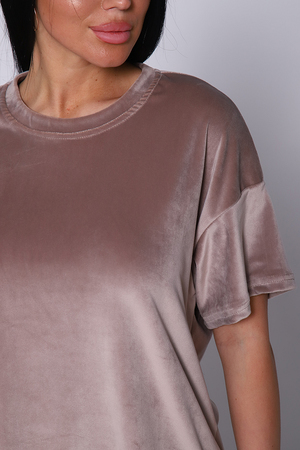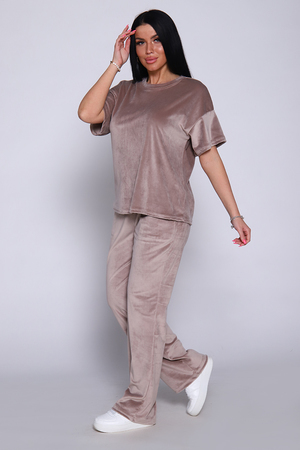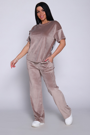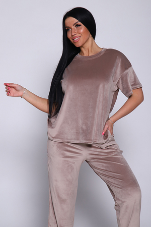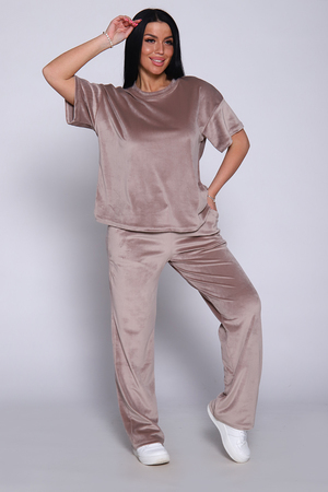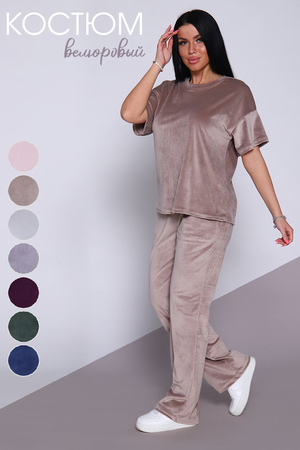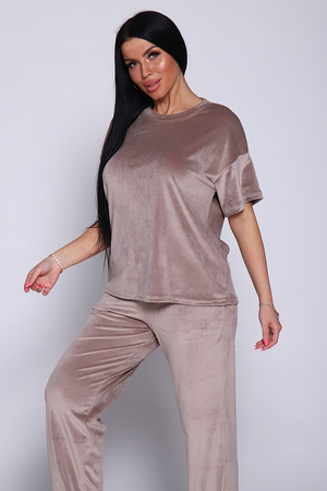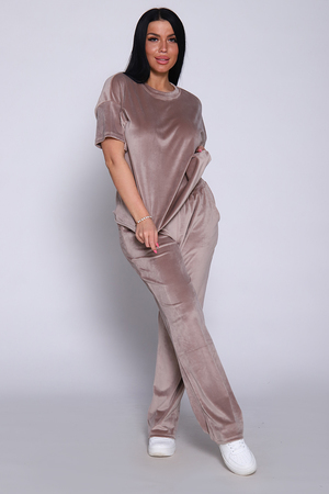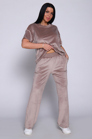 Костюм женский велюровый, повседневный, всесезонный. Костюм состоит из футболки и брюк. Футболка оверсайз прямого силуэта, длиной до бедра. Рукав втачной со спущенным плечом, длиной чуть выше локтя. Горловина с обтачкой, низ футболки с подгибкой. Брюки прямого силуэта, умеренного объема. На передних половинках брюк карманы с отрезным бочком. Пояс притачной с эластичной тесьмой. Низ брюк подгибка. Замеры объема талии брюк по нерастянутой резинке.