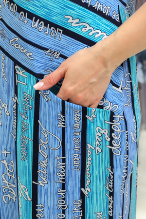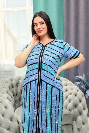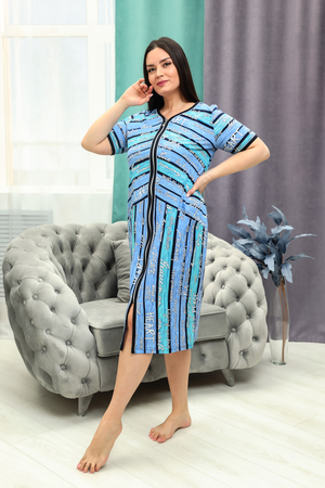 Халат женский полуприлегающего силуэта. Горловина округлая, рукав втачной короткий. Застежка на тесьму-молнию. Халат состоит из верхней и нижней частей с разнонаправленной полосой. На полочке имеются внутренние карманы.