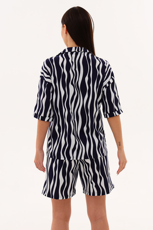 Костюм, состоящий из рубашки и шорт. Рубашка из лёгкого мягкого трикотажного полотна прямого силуэта, на пуговицах, отложной воротник, втачной рукав с манжетами, застёжка на пуговицах. Шорты свободного кроя с боковыми карманами. Пояс обработан на поясной машине, что позволяет после стирки избежать деформации.