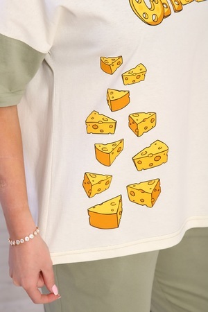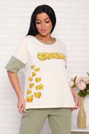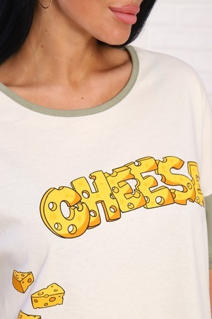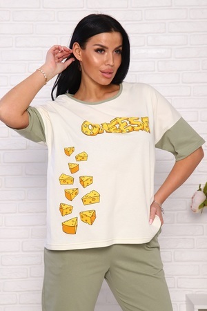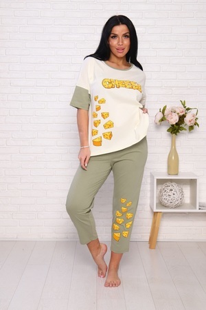 Пижама женская "Сыр": футболка с аппетитным принтом на груди и короткими рукавами, брюки длиной 7/8, прямые с карманами в боковых швах и на комфортном широком мягком поясе. 100% хлопок - комфорт и стиль.